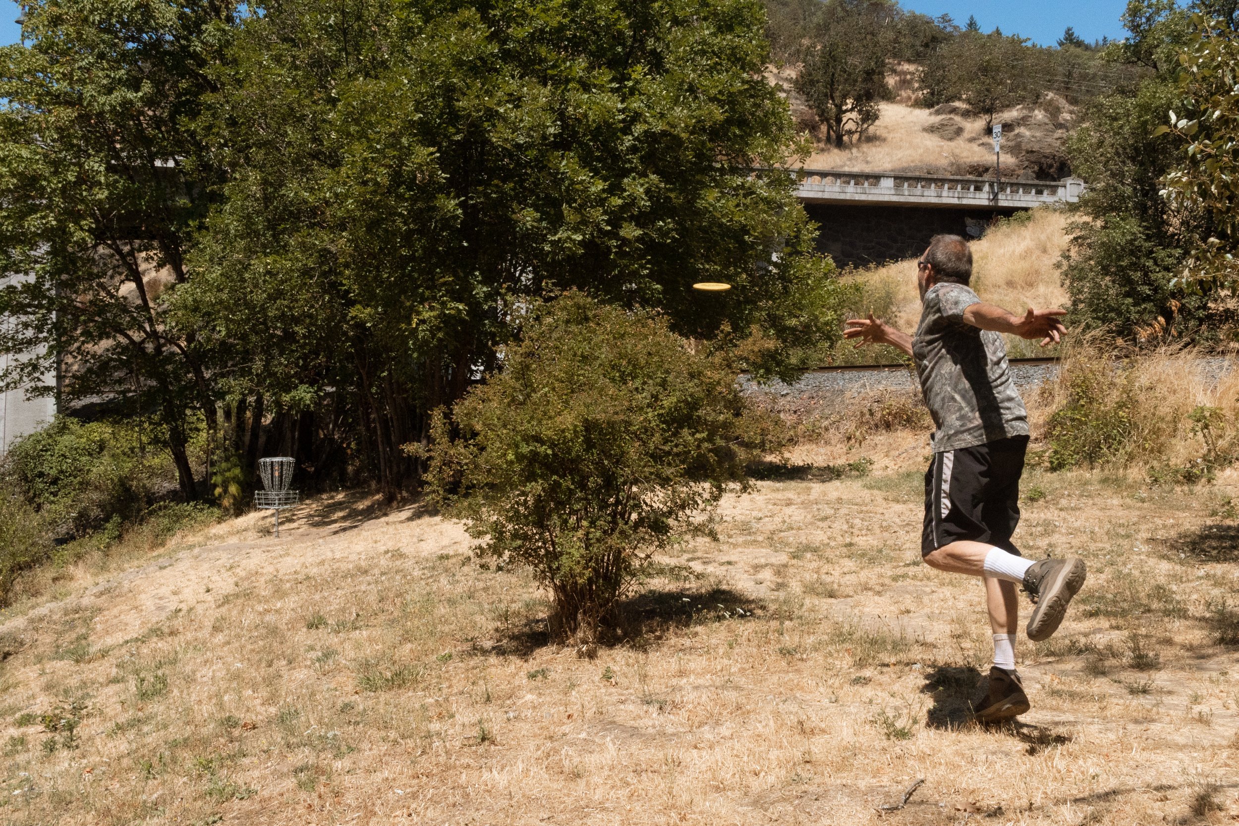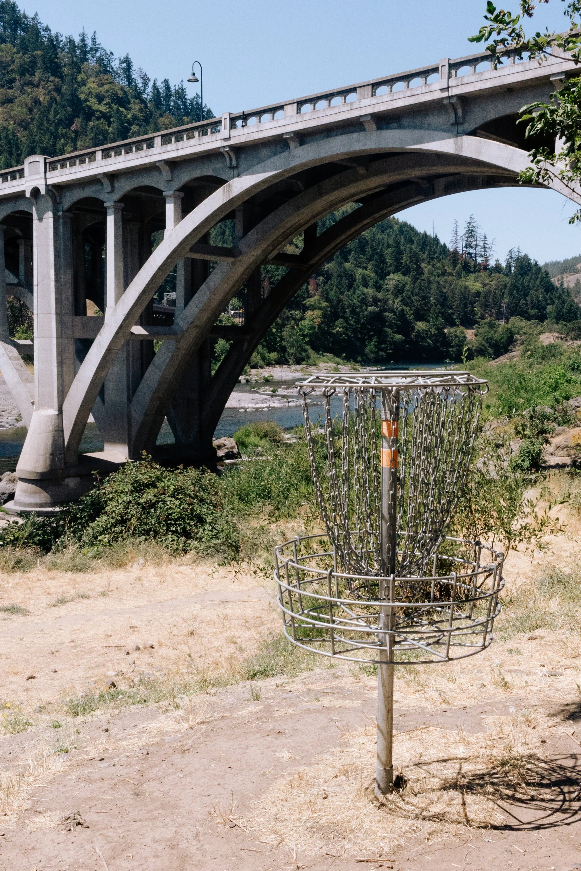 What makes Millsite Disc Golf course iconic is the bridge that crosses the South Umpqua River. Looking at the basket with the arch of the bridge in the background is so visually mesmerizing.